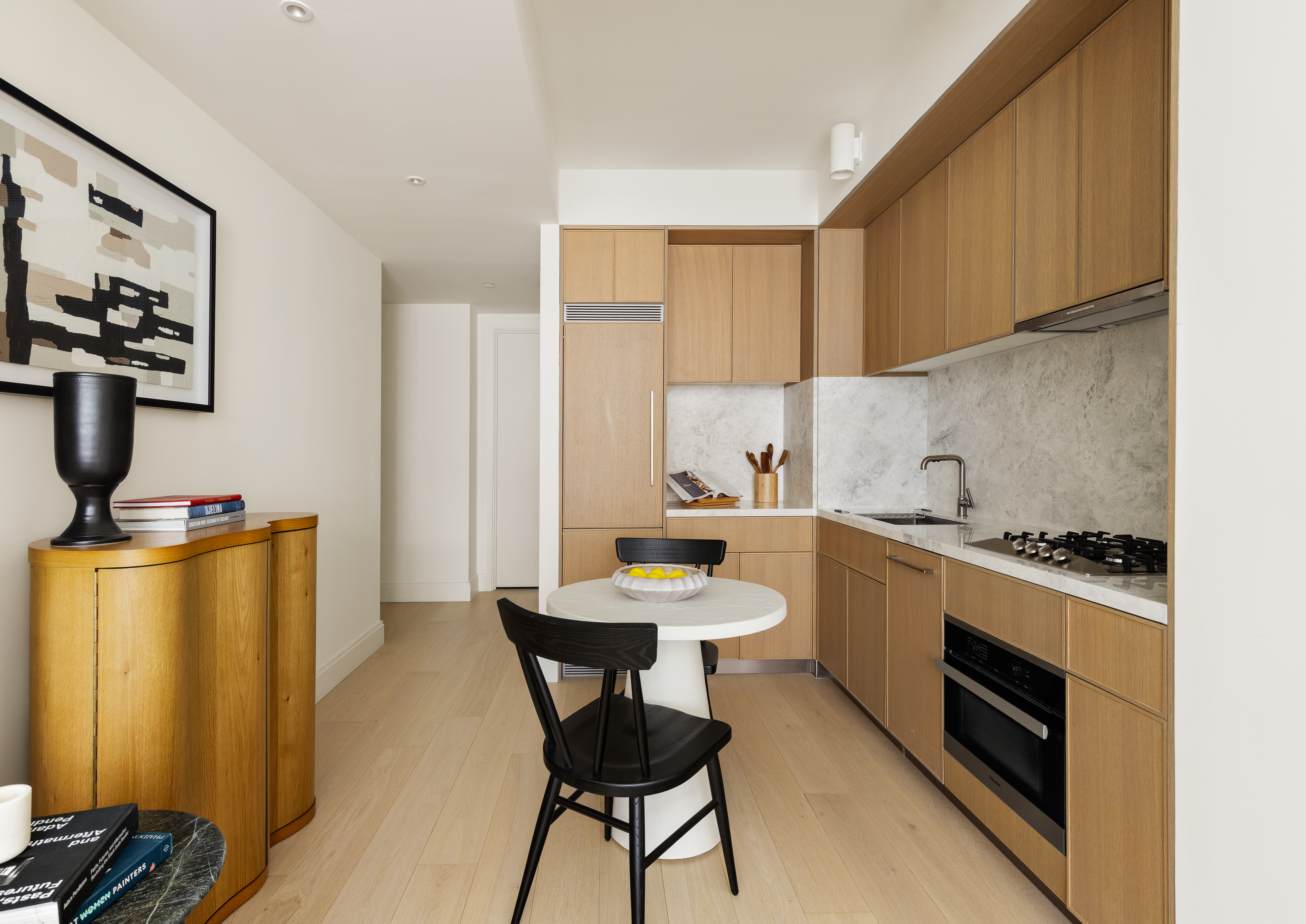 The kitchen is the heart of Eastlight’s homes and a showcase for its sleek materiality and soothing palette. Custom designed and fabricated in Italy, white oak cabinetry with nickel pulls is streamlined and harmonious. A polished white marble countertop and backsplash with gray veining and an integrated Miele appliance package round out this sublime space.