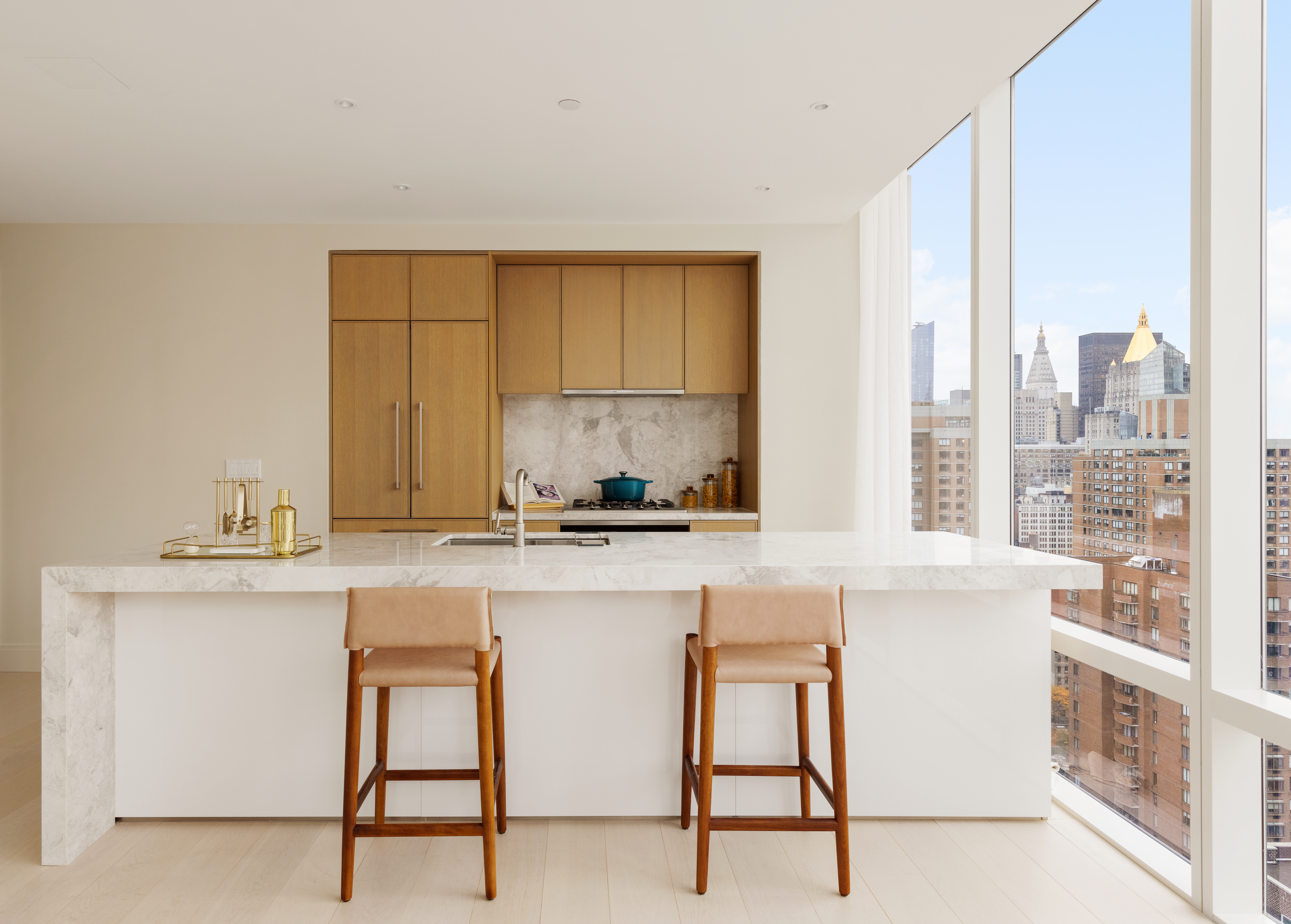 The residences’ living and dining spaces feature open layouts that reflect the way we live today. White oak plank flooring custom designed by CetraRuddy sets the stage for refined everyday living, while floor-to-ceiling windows provide views toward the city skyline. Many homes feature corner living room bays with multiple exposures, allowing for brilliant sunlight, stunning views and an overwhelming sense of serenity.